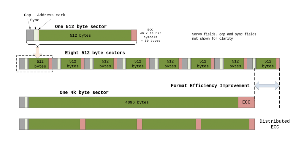 新驱动器使用称为高级格式的新磁盘扇区格式。第一代高级格式,与4K扇区技术相同,通过将原本存储在八个512字节扇区中的数据合并为一个长度为4096字节(4 KiB)的单一扇区,从而更有效地使用存储表面介质。更大的扇区能够集成更强的纠错算法,以在更高存储密度下保持数据完整性。