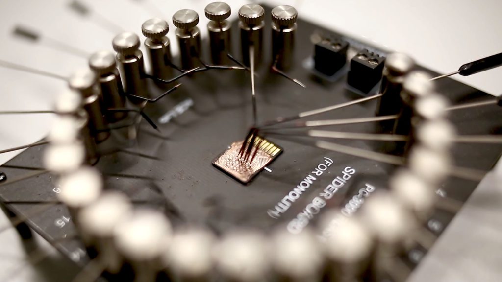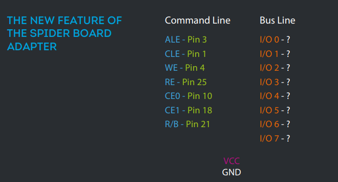 Spider Board适配器设计用于连接到制造为单封装芯片(单片式设备)的基于NAND的闪存驱动器的内部触点。该适配器由25个通用触点组成,支持在相应任务中通过软件配置它们与NAND接口信号的关联。