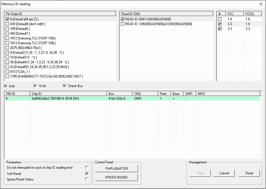 当您更改引脚后,在Spider Board参数窗口中按"确定",然后转到主窗口进行"读取芯片ID"。