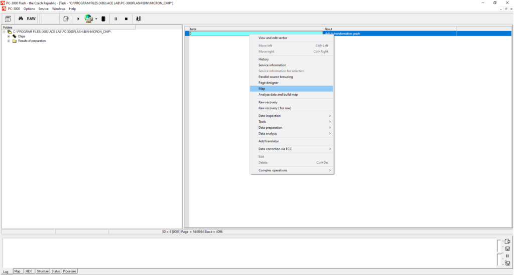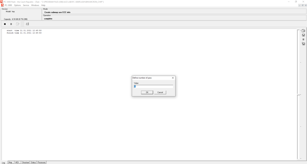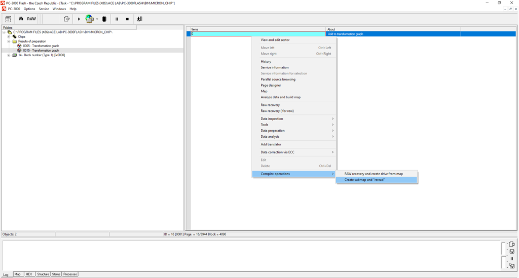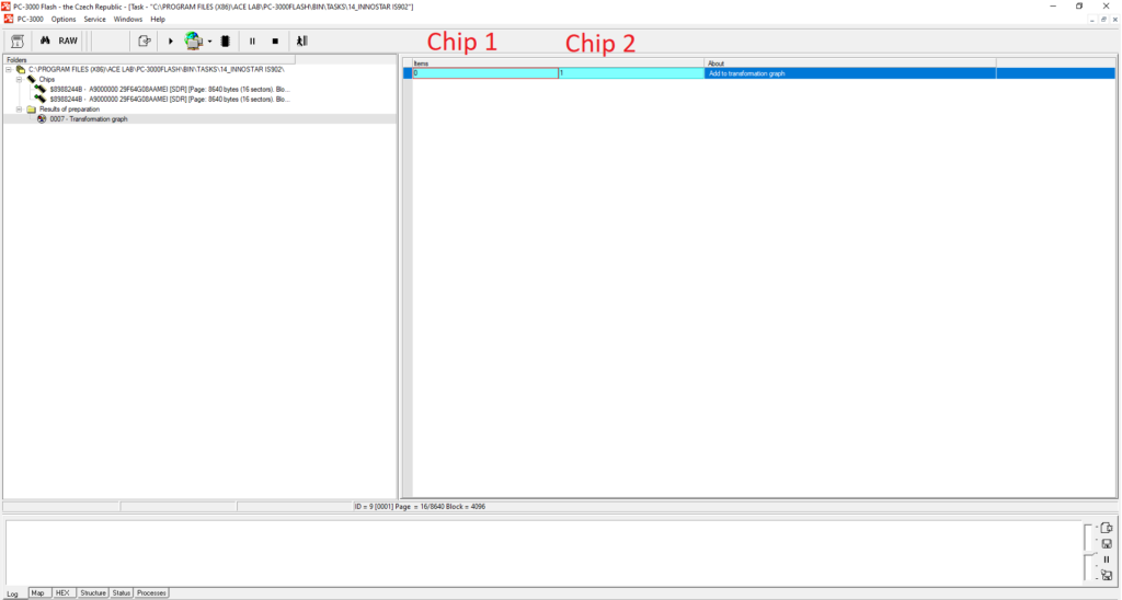 请记住,如果您遇到超过1个芯片的案例,您需要确保在完成重读转储后,将第一个芯片重新插入PC-3000 Flash读取器中。有时,在完成重读转储后,您可能会忘记将第一个芯片再次插入PC-3000 Flash读取器。因此,当ECC校正结束时,您可能会尝试重读第一个芯片(转换图上的第0部分),而读取器中却是第二个芯片。最终,您将得到两个本应不同但却相似的部分。因此,在开始重读过程之前,请注意读取器中的芯片。