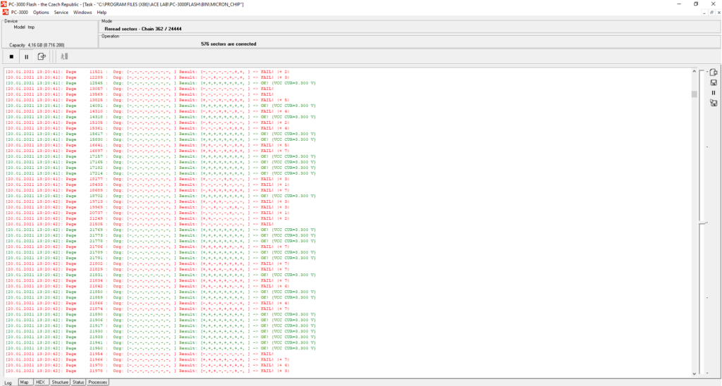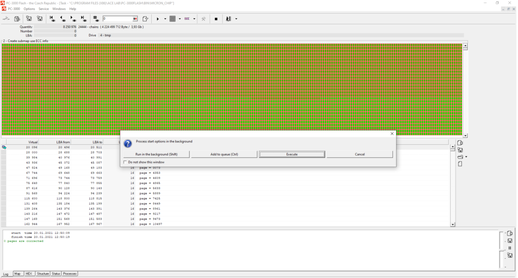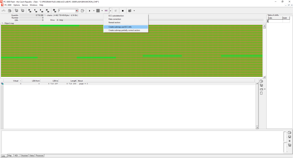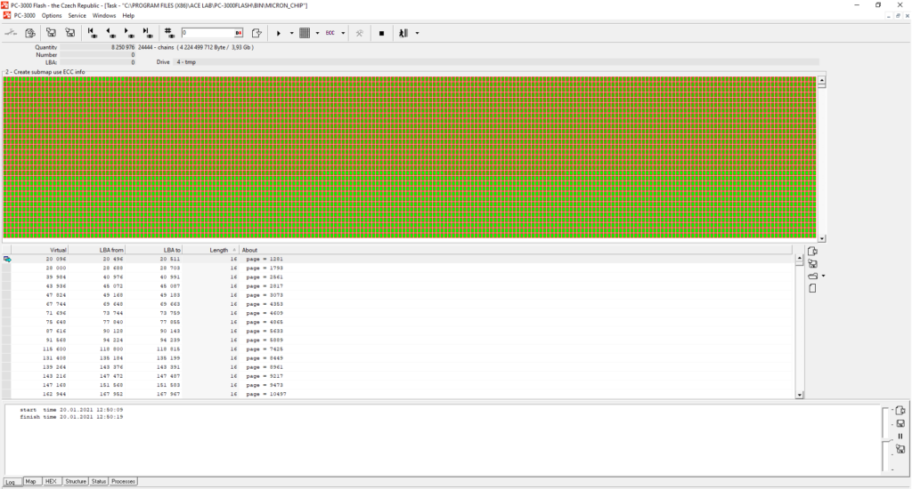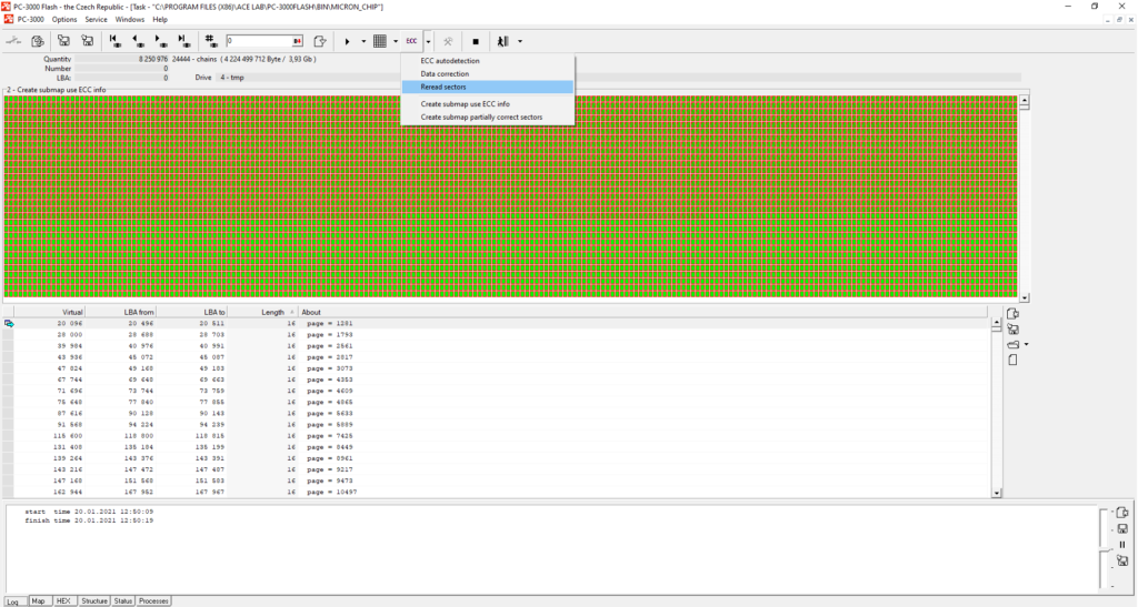 从下面的例子中您可以看到,在这种情况下ECC校正进行得不太顺利。校正质量取决于许多因素——这就是为什么当ECC校正结束时,您应该始终使用ECC信息构建映射,以检查还有多少扇区未被校正。