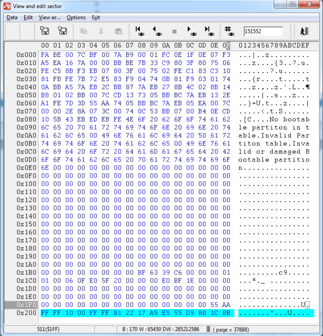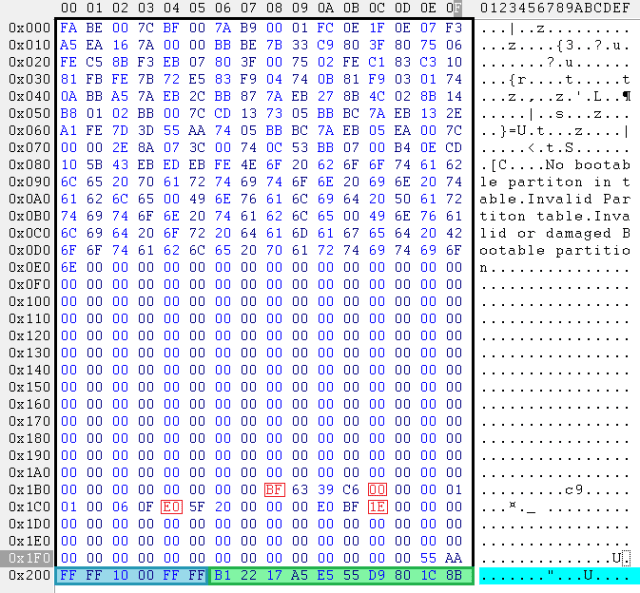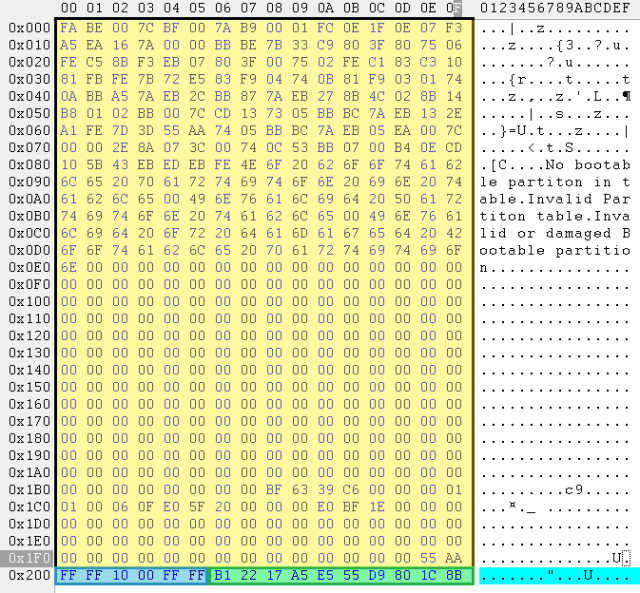 来自旧SLC NAND芯片的通用MBR扇区,页面大小为2112字节,扇区大小为528字节: