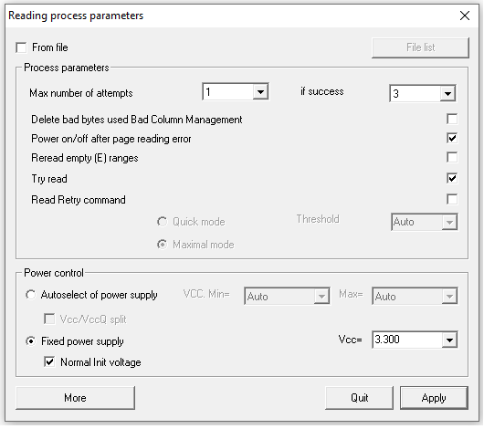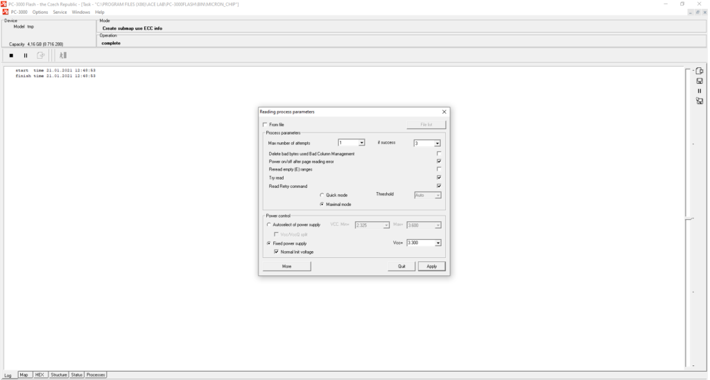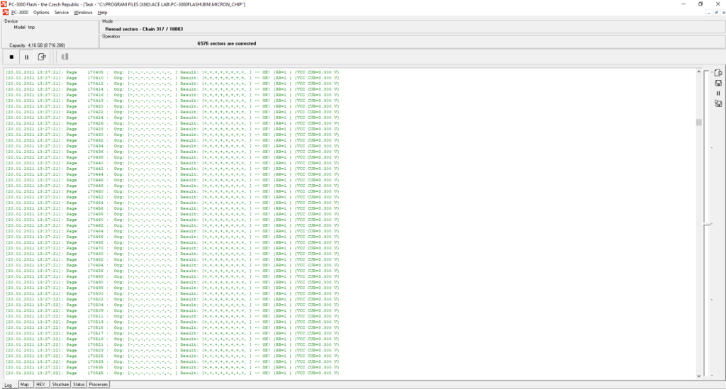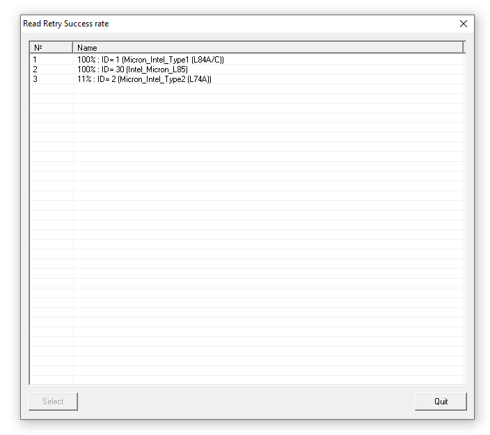 在这种情况下,我们需要使用另一个功能——读取重试。这是一个特殊的NAND芯片命令,允许NAND存储芯片自行改变电压。NAND核心开始使用不同的电压电平来修复数据。这是一种特殊的自我修复系统,存在于所有QLC/TLC芯片以及一些现代MLC芯片中。目前,PC-3000 Flash支持针对大量QLC/TLC/MLC存储芯片的多种读取重试模式。随着每周PC-3000 Flash资源的更新,我们的工程师会为它们添加新的算法。