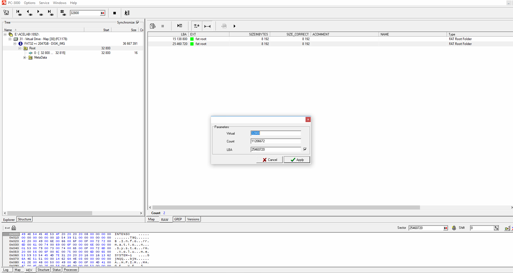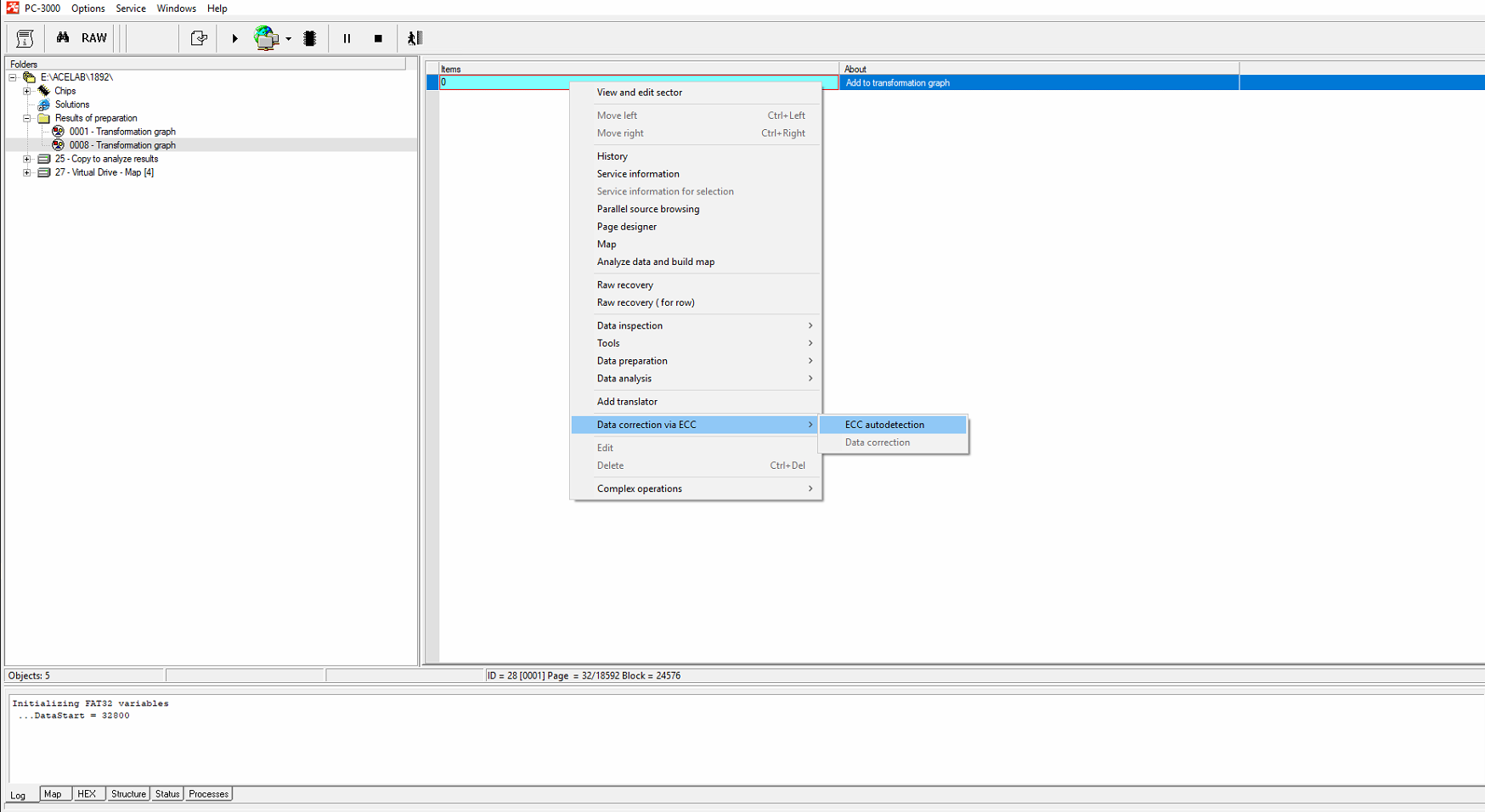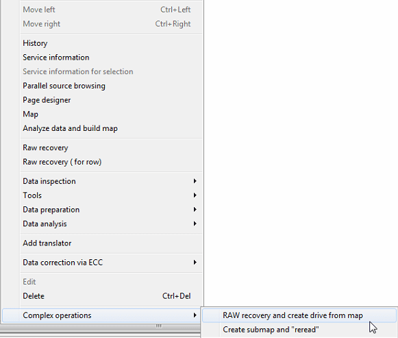 步骤 5. 我们需要在最后一个图上从复合操作菜单中启动“原始恢复并从MAP创建虚拟驱动器”选项。此一键式选项在PC-3000 Flash 版本 7.4.17 及更高版本中可用。