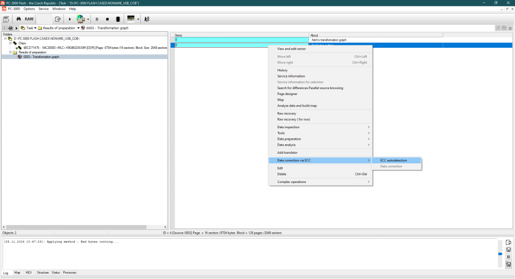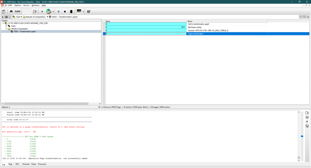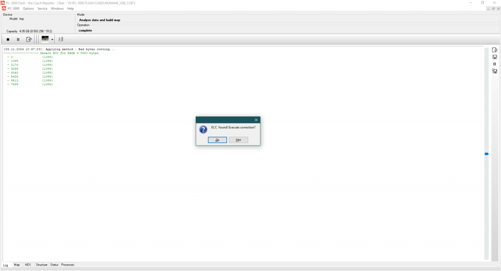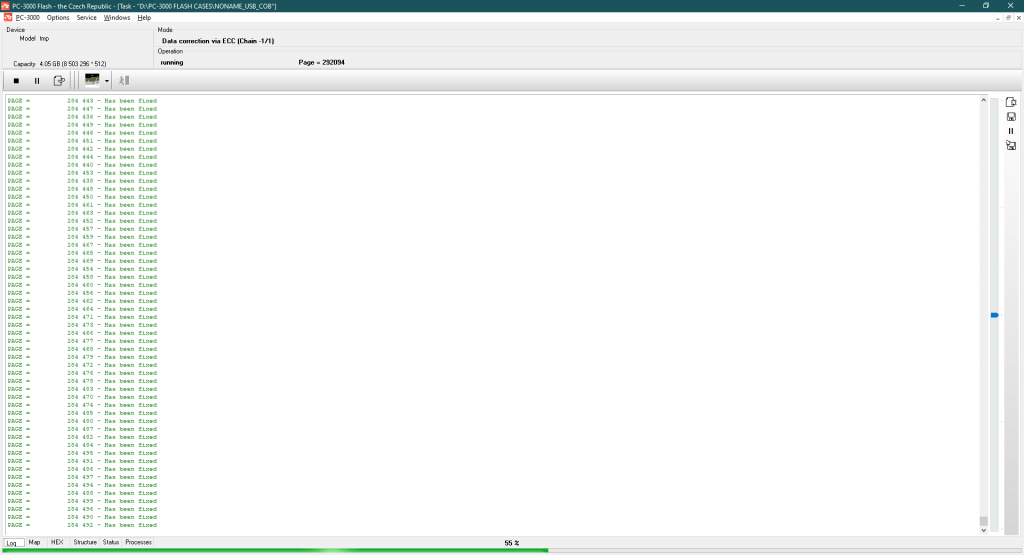 我们找到了ECC码,现在 – 是时候修复转储中的所有比特错误了。这里的ECC类型是1085 x8。这里的好消息是MLC存储器。这个芯片的质量足够好,可以完全跳过重读过程 – 所有错误都已通过错误校正码修复。对于如此旧的MLC存储器来说,这是一个惊人的结果!