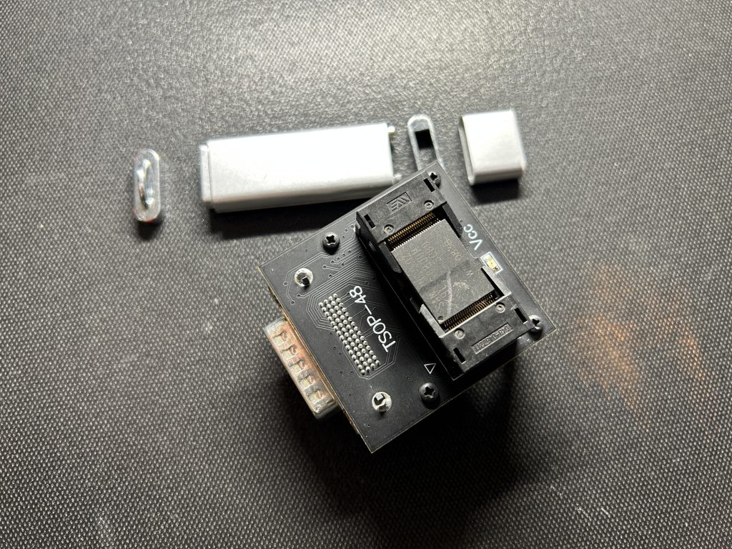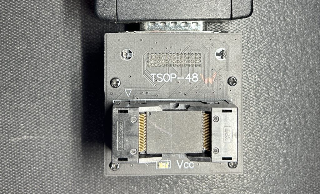 为了读取这种宽体芯片,我们需要使用特殊的TSOP-48W适配器,因为经典的TSOP-48有塑料固定边框,不允许我们将更大的芯片放入: