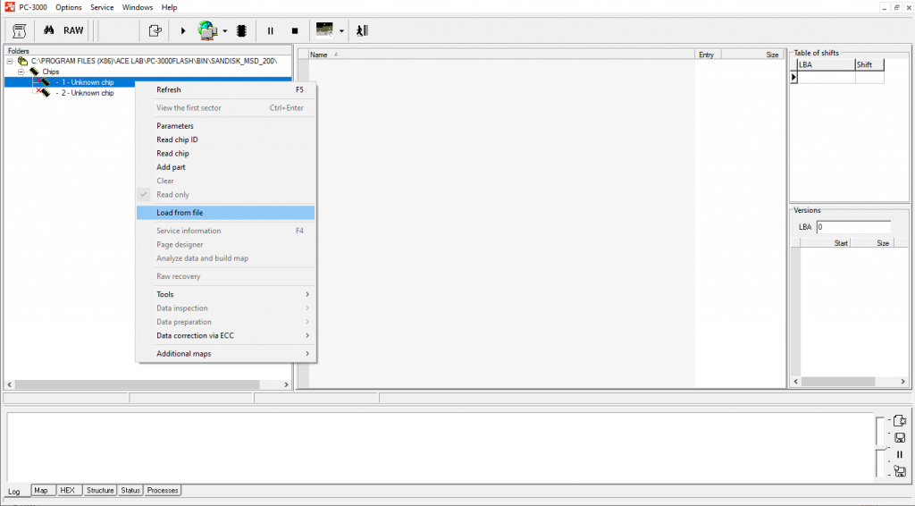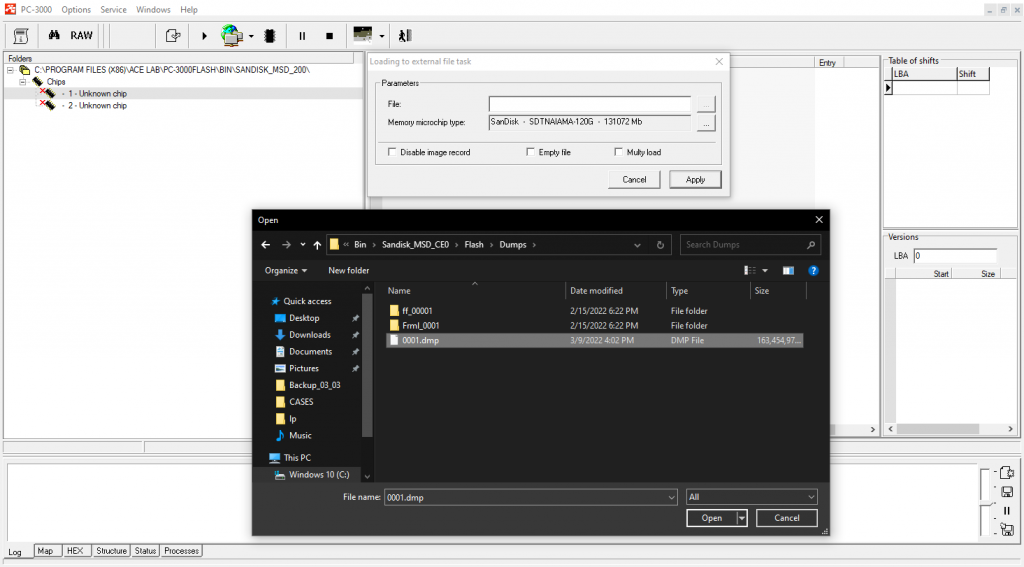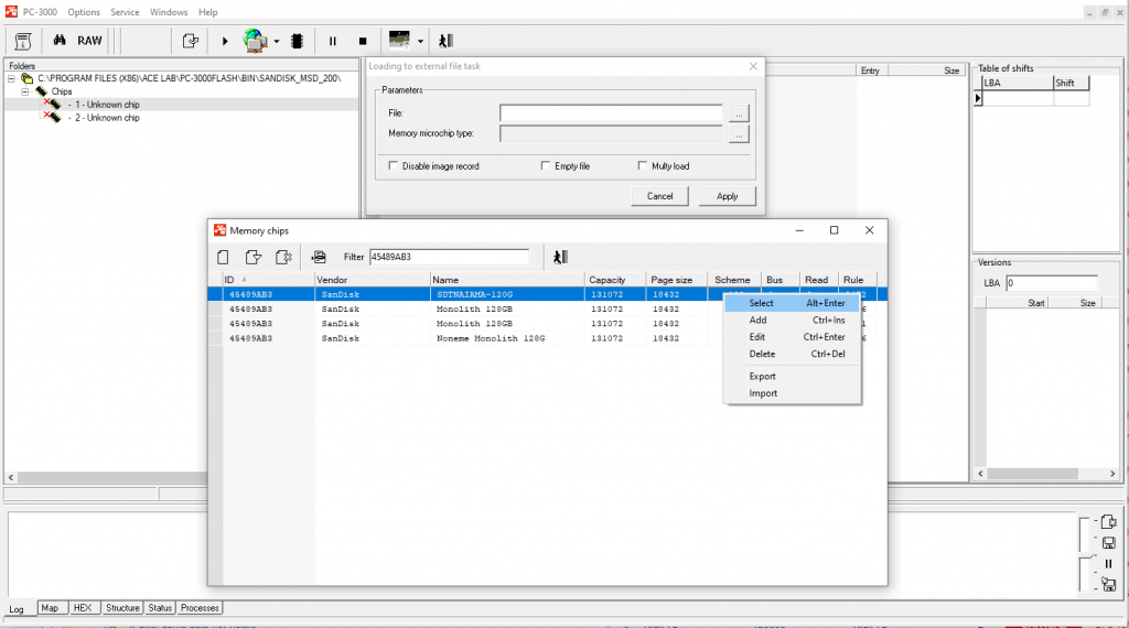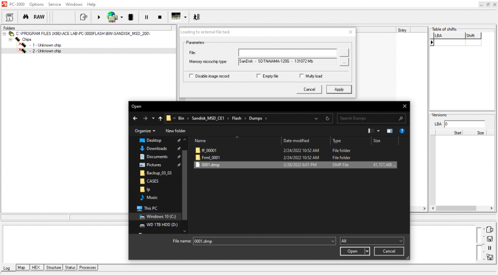 使用从文件加载,我们为第一个芯片选择合适的ID(我们从第一个任务中获取ID – 用于128 GB SanDisk NAND的ID),并选择第一个任务中的转储文件进行加载。