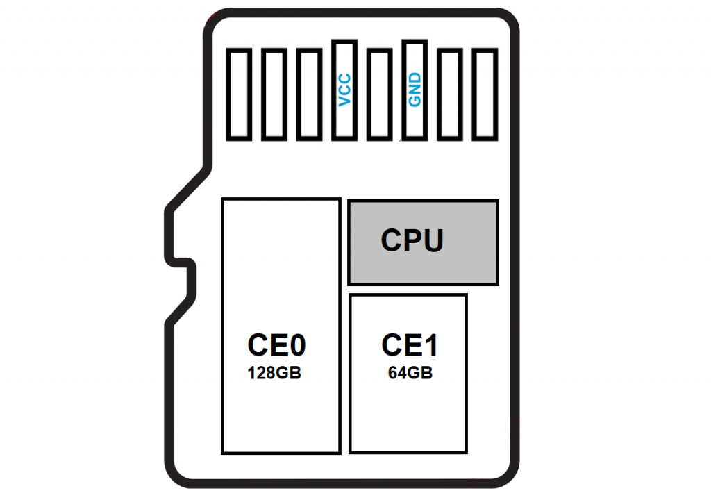 这款单片式存储设备的特别之处在于它有两个晶片,一个128 GB,另一个64 GB。由于部件容量的差异,我们需要在不同的任务中分别读取每个芯片,以便稍后将它们合并为一个。