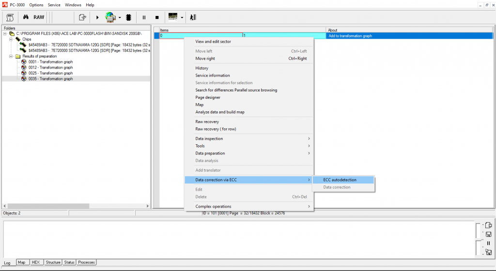 现在我们需要再次启动ECC校正以创建新的扇区状态映射。我们之前已经修复了ECC并进行了重新读取,但是为了良好的转换器组装,需要在新任务中再次形成ECC映射(转换器使用关于好扇区和坏扇区的信息):