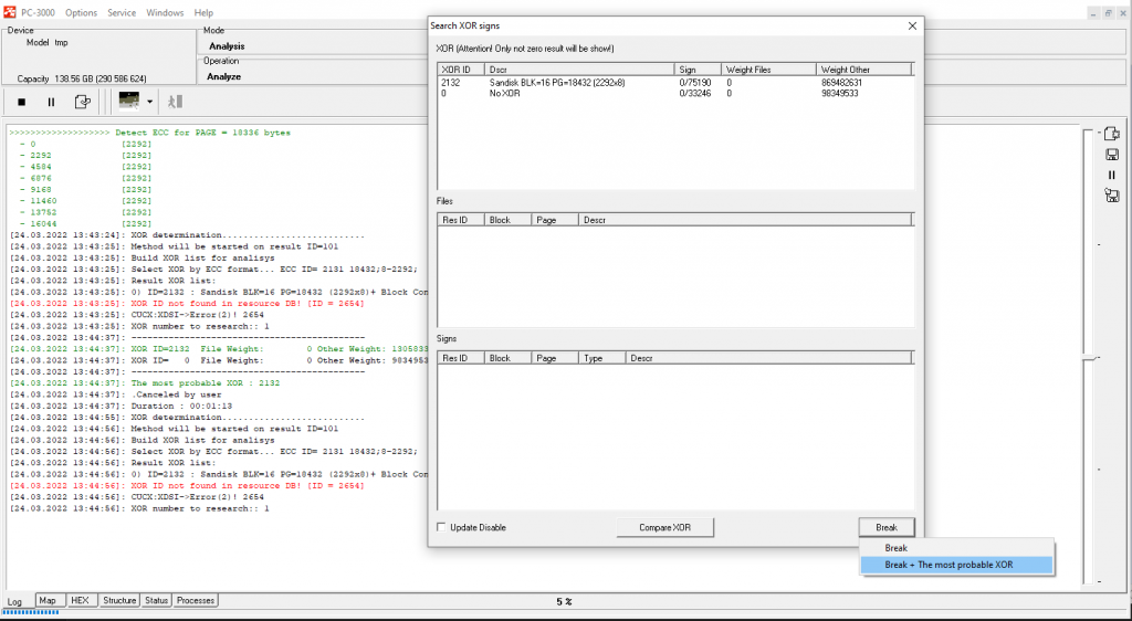 SanDisk使用SLC缓存来存储最新记录的数据。在MLC/TLC存储器上,控制器以SLC模式写入数据,然后在后台将其转换为TLC/MLC。主要思想是,使用SLC记录类型时,SanDisk使用大约20-30%的容量作为缓存,这使得写入操作比通常快得多。如果闪存在写入过程中损坏,文件系统和最新记录的文件很可能仍留在SLC中,并且它们的恢复将是不可能的。恢复SLC缓存的唯一方法是使用转换器。