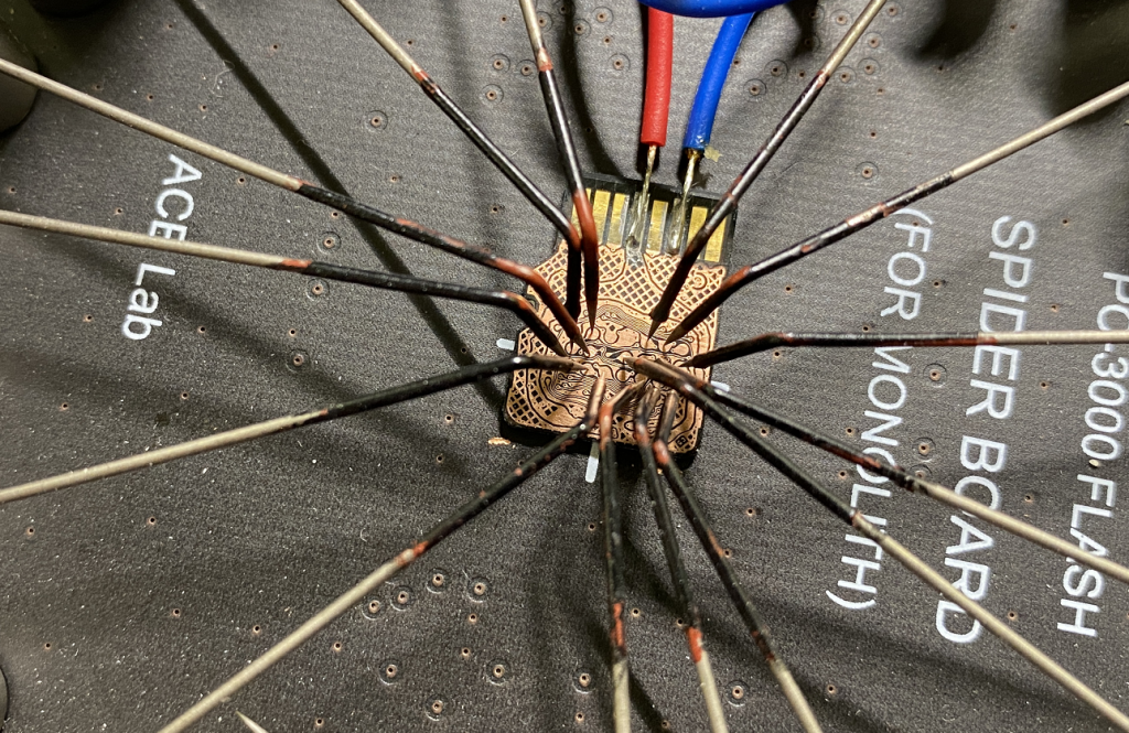 用双面胶带将单片式存储设备固定到Spider Board垫上,连接电源线,并根据示意图设置所有引脚。