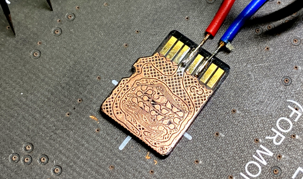 让我们根据mSD类型1引脚排列方案,将电源线焊接到单片式存储设备的引脚上。