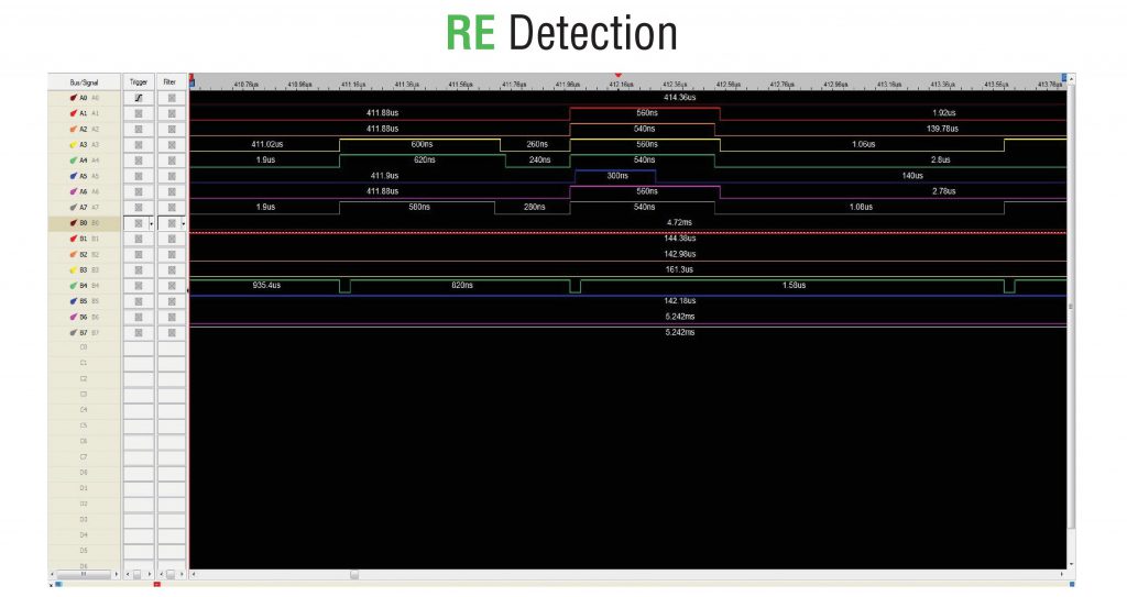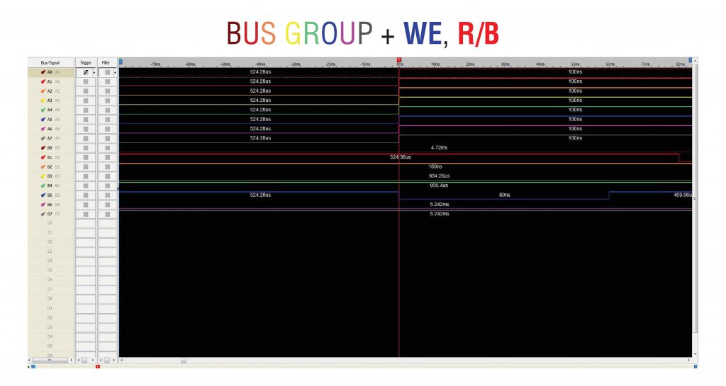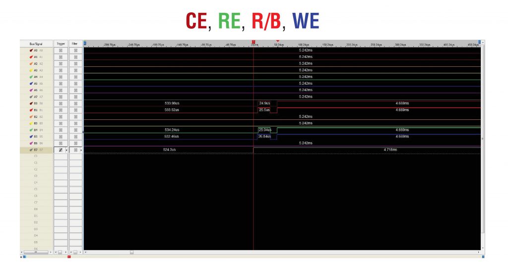 接下来,让我们尝试检测我们的总线组以及WE、R/B位于何处。使用以下方案,我们将检测它们各自的位置。我们知道当WE下降时,I/Ox(总线)中的所有线路都应该上升。一段时间后,R/B也应该下降。让我们看看: