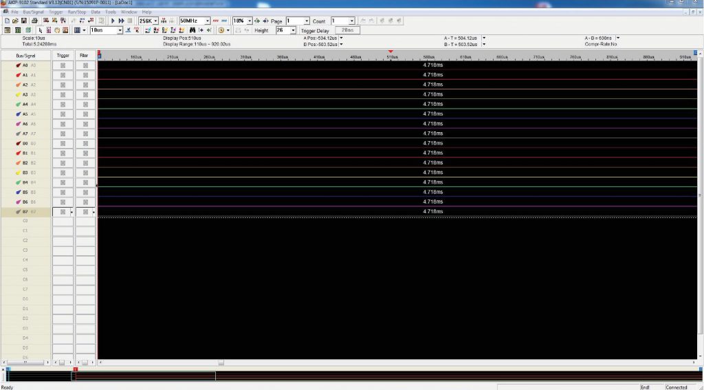 这是АКИП-9102逻辑分析仪软件的主屏幕。我们发现24条线路中,有8条连接到GND、VCC或在电源开启后状态不变。这就是为什么我们只保留其中的16条 – 那些值发生变化的线路。LA的设置如下所示: