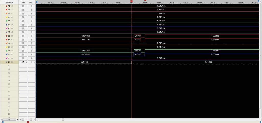 另外,请注意基于PC的逻辑分析仪(以下简称LA)没有足够的内存来实时显示所有线路的变化。这就是为什么在电源开启后的前5-10秒内,LA会制作一个快照(位于屏幕下方),这将允许我们沿着它移动,改变比例尺并查看线路如何变化。