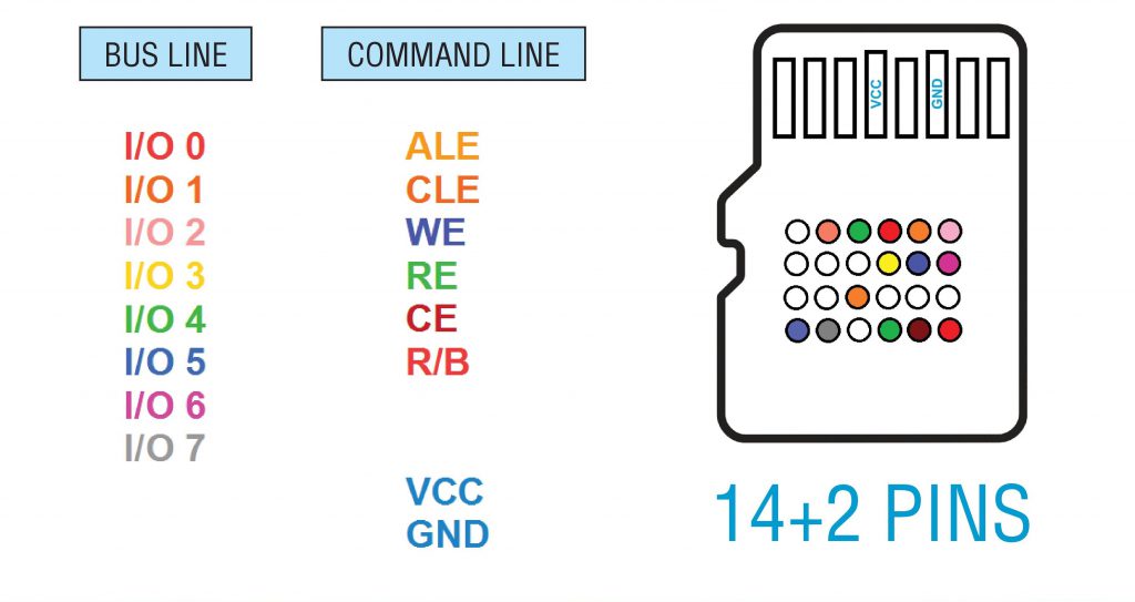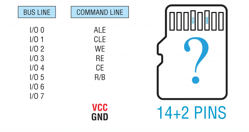 通常,VCC和GND不需要在技术引脚上找到。你可以直接使用默认的单片式存储设备接口来供电。但当然,有时GND和VCC引脚也可能出现在技术引脚排列上,我们建议检查所有引脚并在引脚图上也找到GND和VCC。这将帮助我们检测应从研究中排除的引脚。