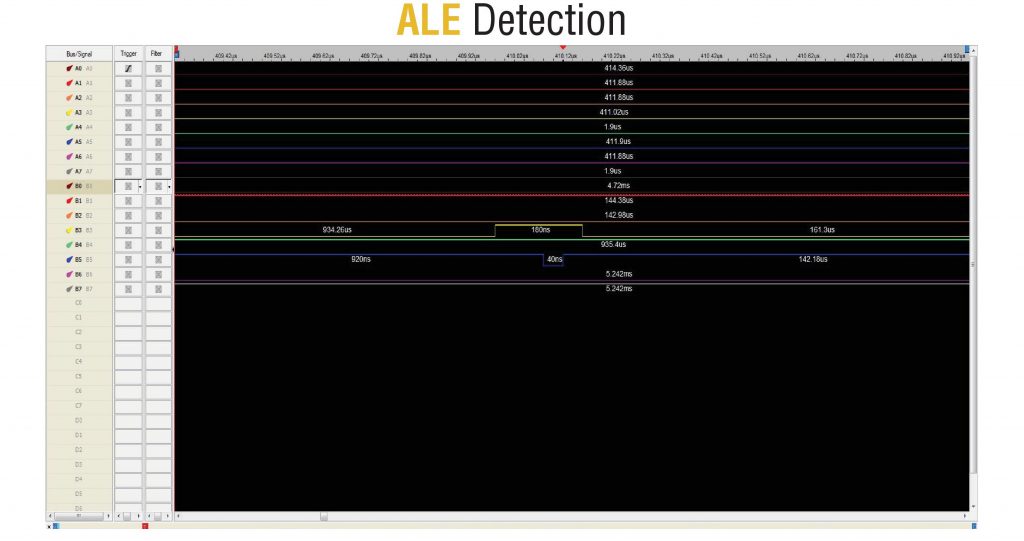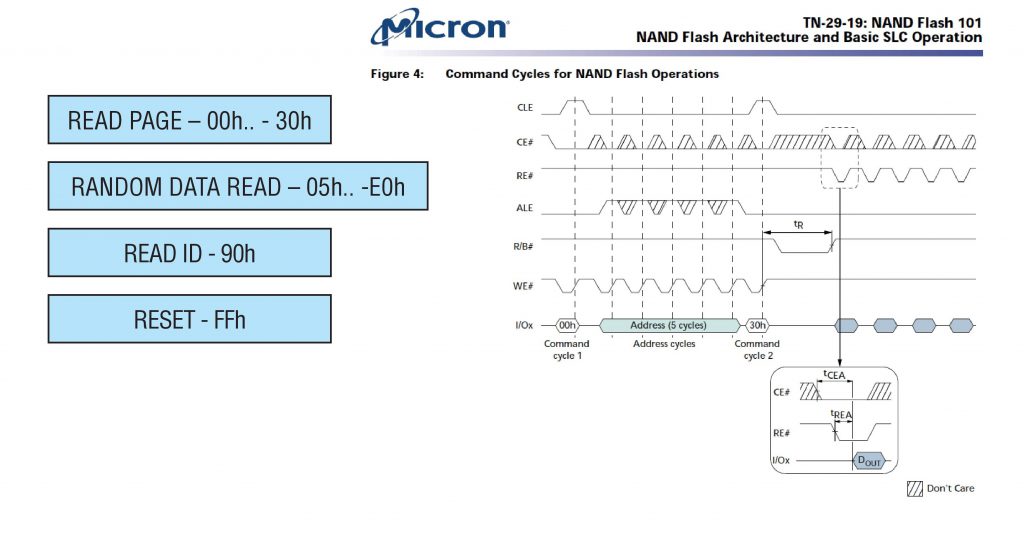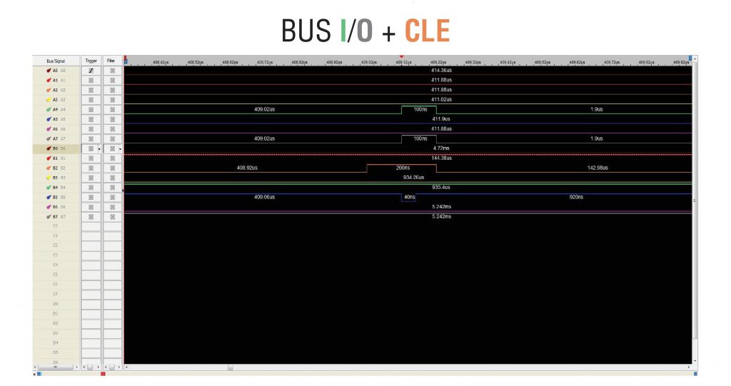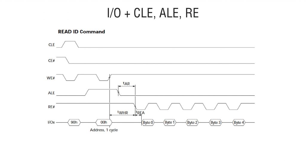 使用NAND信号的文档,我们知道电源开启后发生小幅跳变的前4个触点 – 是CE、RE、R/B、WE。现在我们不知道它们各自的确切位置,但至少我们知道这4条线路 – 是我们的目标。
