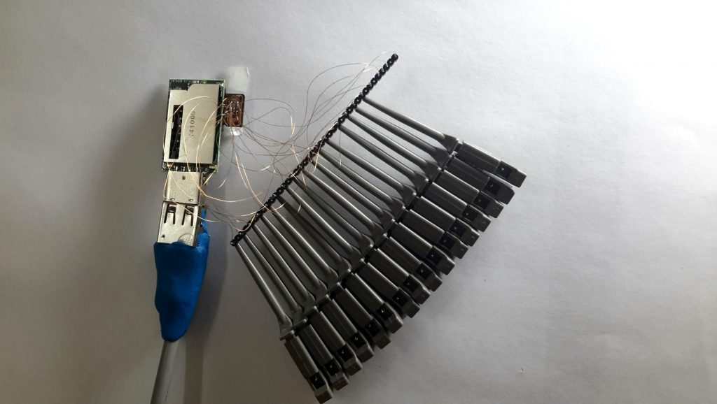 让我们准备我们的单片式存储设备。如前所述,这是一个MicroSD卡,我们将其焊接到特殊的电路PCB上以便于操作过程。我们应该将所有目标引脚(不包括VCC和GND)焊上电线。这个准备的主要思想是 – 单片式存储设备应通过技术引脚焊接 + 应通过SD或microSD接口连接。在我们的示例中,我们放入microSD转SD适配器,以便在其上进行读写操作。