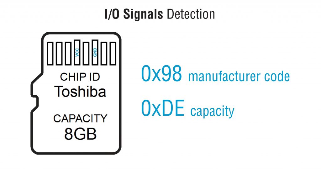 我们在寻找什么?我们试图找到所有技术输出信号,这将帮助我们找到引脚排列。在我们的示例中,我们将采用一个具有8位总线的普通MicroSD卡。最终,我们应该找到以下触点:
