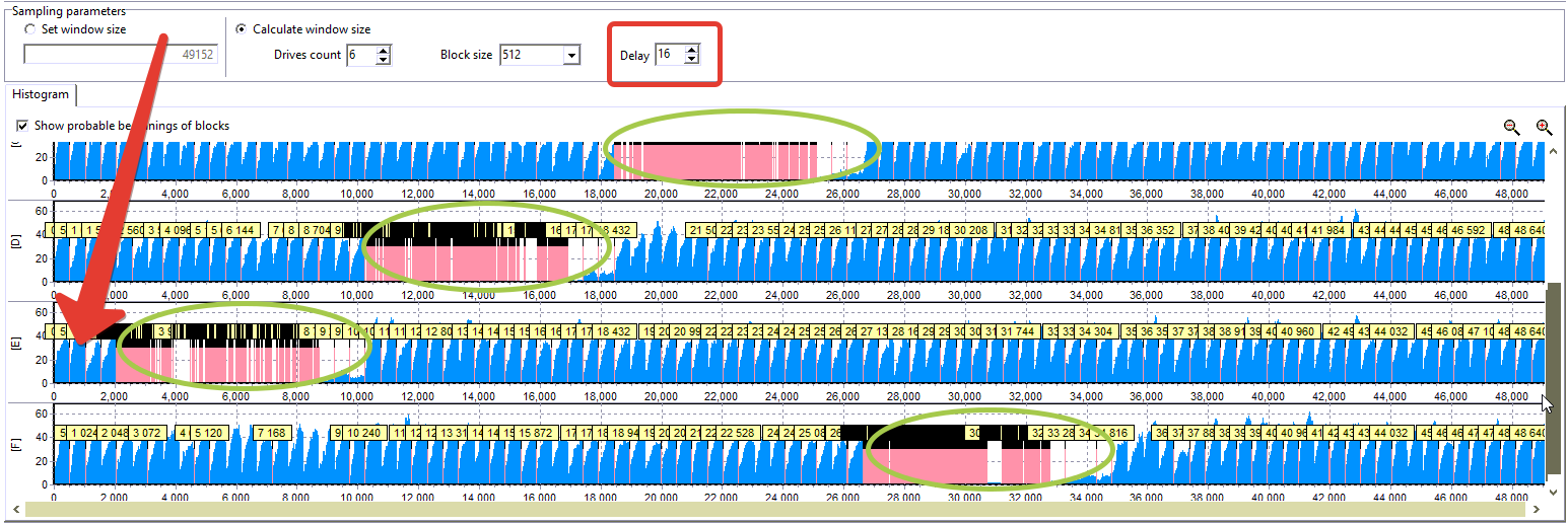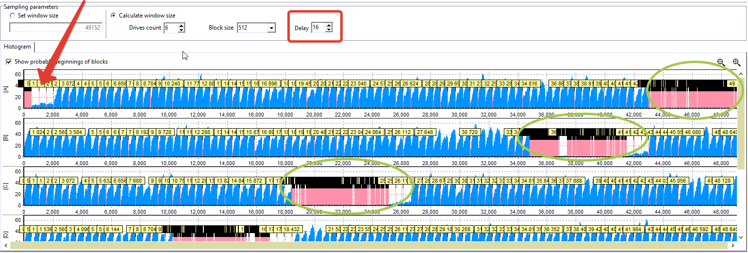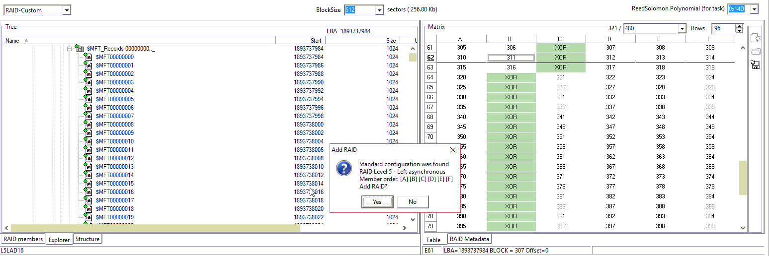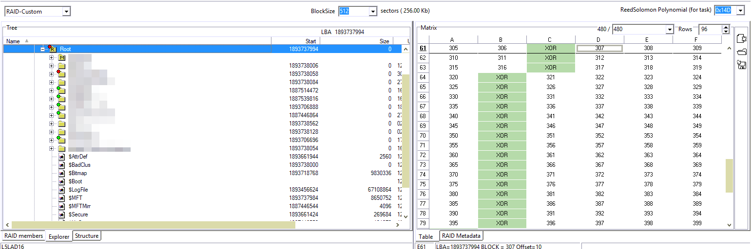 从 RAID 阵列恢复数据的"瑞士军刀"是 RAW 恢复和统计分析。我们对所有成员在 125,000,000 扇区之后的部分启动 RAW 恢复并查看结果。