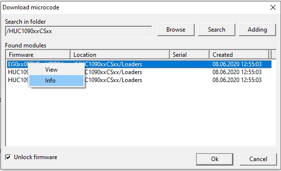 “解锁固件”字段中选中的复选框意味着固件将以特殊模式写入,该模式允许固件加载另一个供应商。