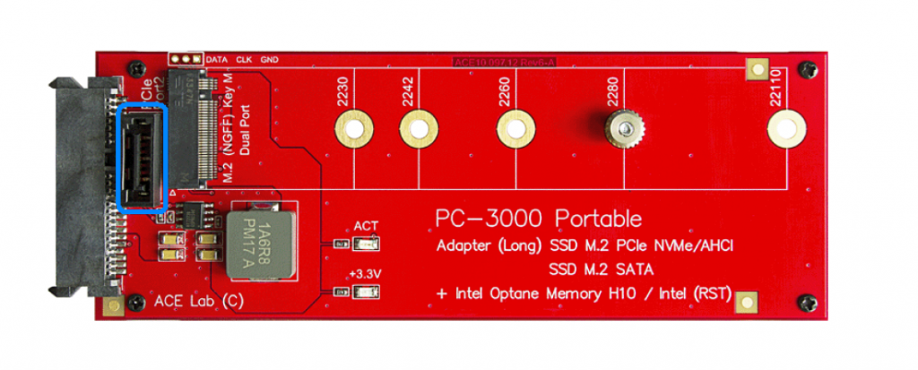 PC-3000 SSD Extended 是新的软件附加组件,支持最广泛的 SSD 类型:SATA、mSATA、M.2 SATA、M.2 PCIe NVMe/AHCI、PCIe x16、Apple Macbook、LIF、ZIF、PATA、Intel Optane H10/H20。PCIe 驱动器通过 ACE Lab 的特殊适配器连接: