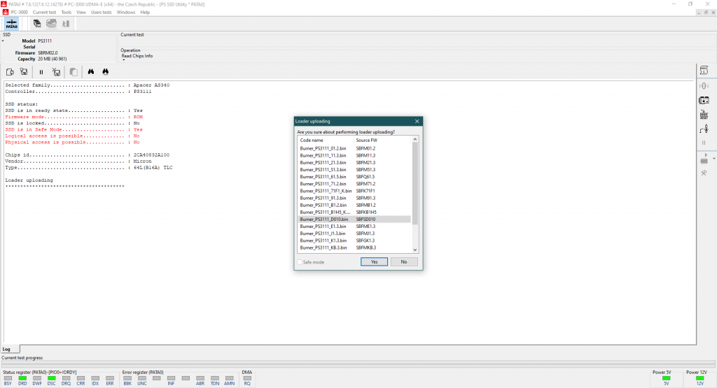然后,让我们加载加载程序——这是由 ACE Lab 工程师修改和优化的驱动器固件,它允许我们解锁技术模式并访问内部服务区。正确的加载程序已被高亮显示。所以,只需按照工具的推荐操作,保留所有默认设置即可。顺便说一下,芯片相当旧了——Micron 64 Layer B16A TLC…