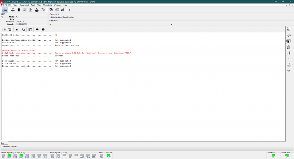 驱动器始终处于 BSY 状态。对于 SSD 来说,由于内部固件损坏,驱动器通常会进入一个循环:加载固件 – 错误 – 重置 – 加载固件 – 错误 – 重置… 这就是为什么我们在屏幕左下角看到 BSY LED 寄存器。