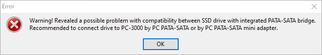 由于硬件限制,为了将 PS3111 驱动器正确连接到 PC-3000 UDMA-E 和 PC-3000 Express,我们需要使用 PATA 转 SATA 适配器。否则,您将在加载程序上传阶段看到错误: