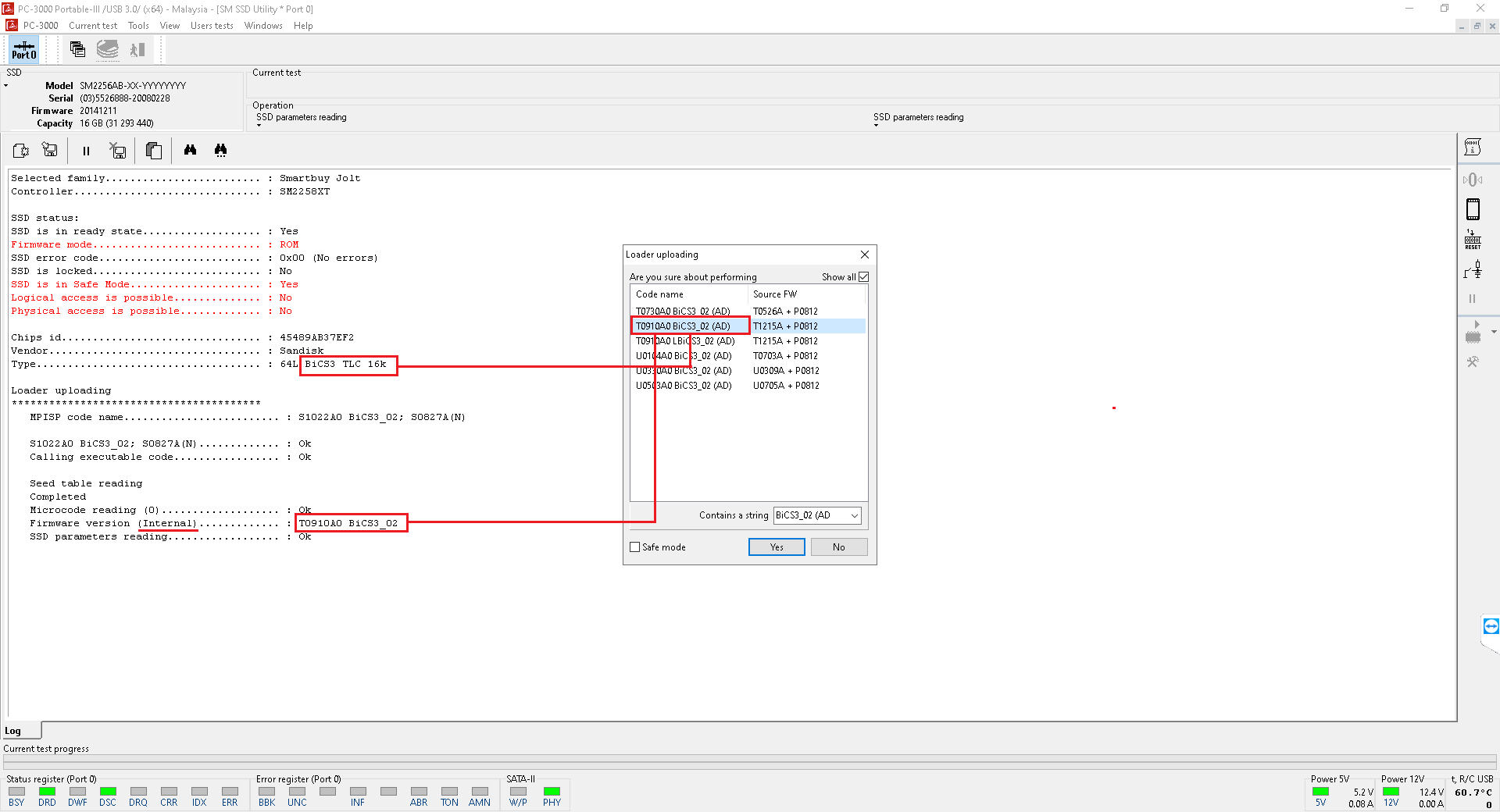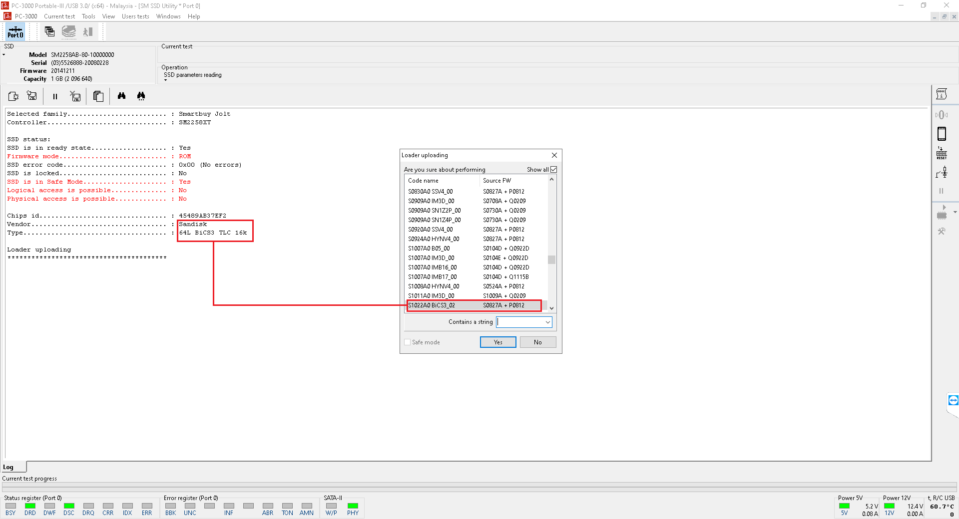 在第一次尝试上传加载程序后,我们终于可以读取有关内部固件的信息了!它是 T0910A0 BiCS3_02。必须从加载程序列表中选择这个: