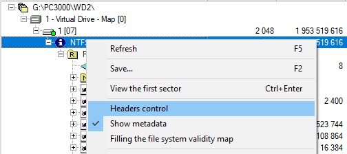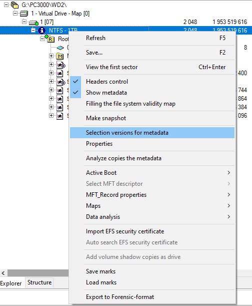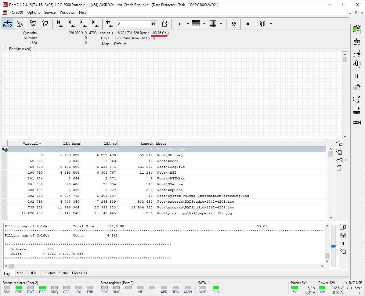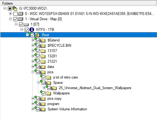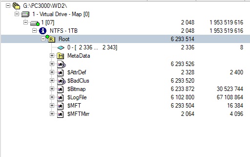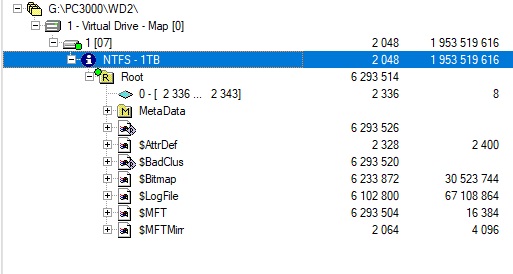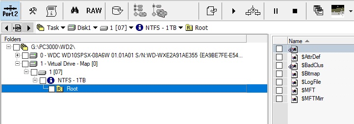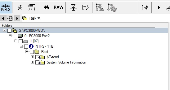 让我们进入 PC-3000 Data Extractor 检查驱动器中的数据。在文件夹树中,我们只看到 Windows 首次格式化 HDD 后出现的标准文件夹。