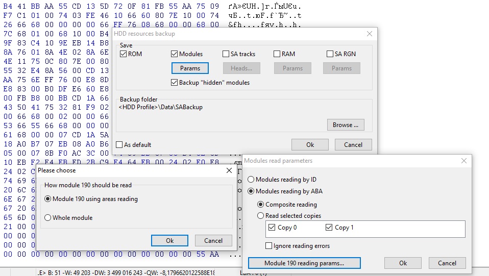 在此阶段,我们建议取消勾选服务区磁道,使用复合读取保存模块,并手动选择使用区域读取方式读取模块 190,以更快地完成初始备份。