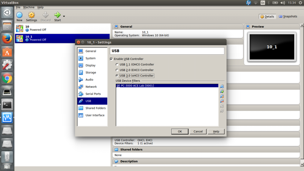 默认情况下,我的虚拟机使用USB 2.0仿真,PC-3000中的读取速度约为4 Mb/s,因此读取耗时约45分钟。这极其缓慢,我决定切换并尝试USB 3.0。