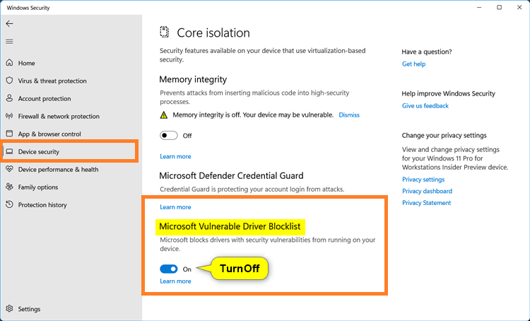 对于Windows 11,同样重要的是禁用易受攻击的驱动程序阻止列表: