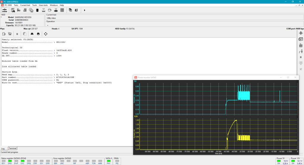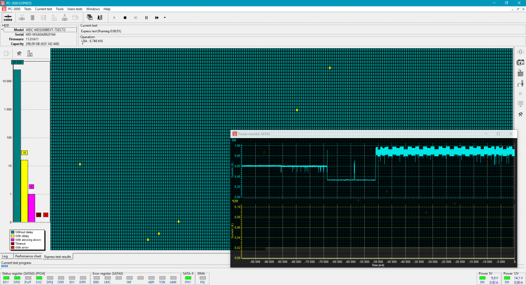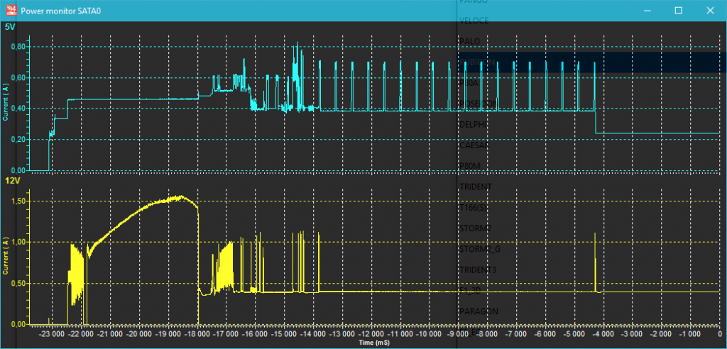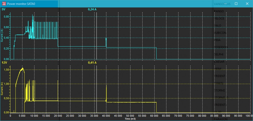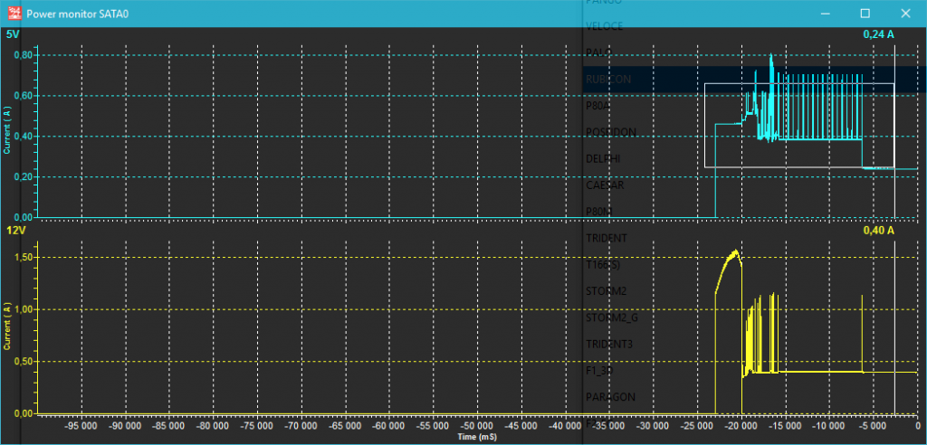 最后,在大规模使用驱动器时(如带有复杂数学运算的验证测试),功耗增长到最大值!电流下降的小线是驱动器扇区读取有延迟的地方(黄色和紫色):