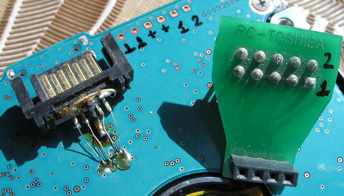 东芝驱动器中焊接SATA的过程与WD相同:拆下USB桥接器和MCU之间的4个电容器,并在那里焊接SATA端口。需要使用PC-Toshiba终端适配器,这是WD和东芝处理之间的唯一区别。